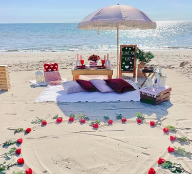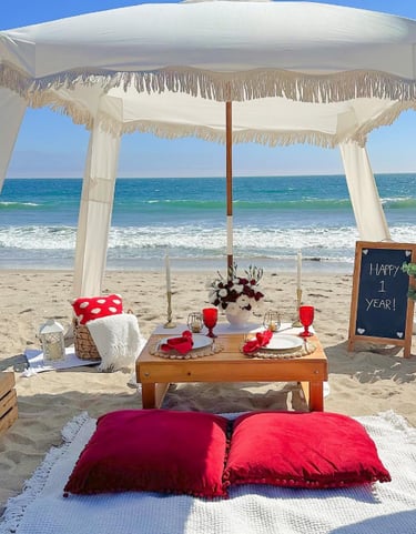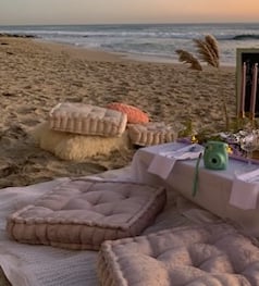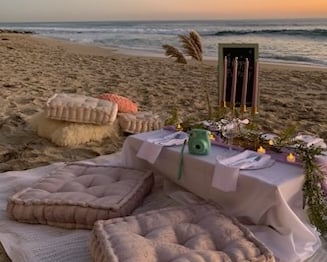 Includes: setup & clean up, dinnerware, flatware, linen napkins, serving tray, flowers, candle sticks, complimentary water, rug, pillows & blankets.