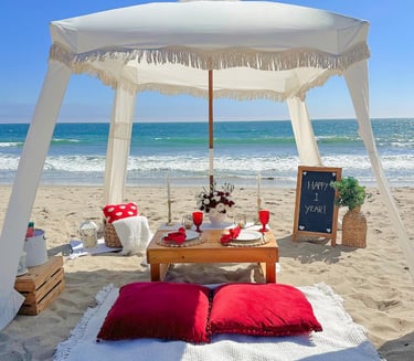 Includes: setup & clean up, luxury beach cabana, beach loungers, side table, ice bucket, complimentary water