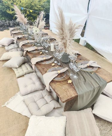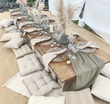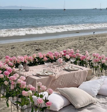 Includes: set up & clean up, large picnic table(s), dinnerware, flatware, linen napkins, ice bucket, complimentary water, rugs, pillows, blankets, artificial floral arrangement ($65 up-charge for fresh florals), candle sticks, custom letter board message, string lights (evening picnics only) & bluetooth speaker